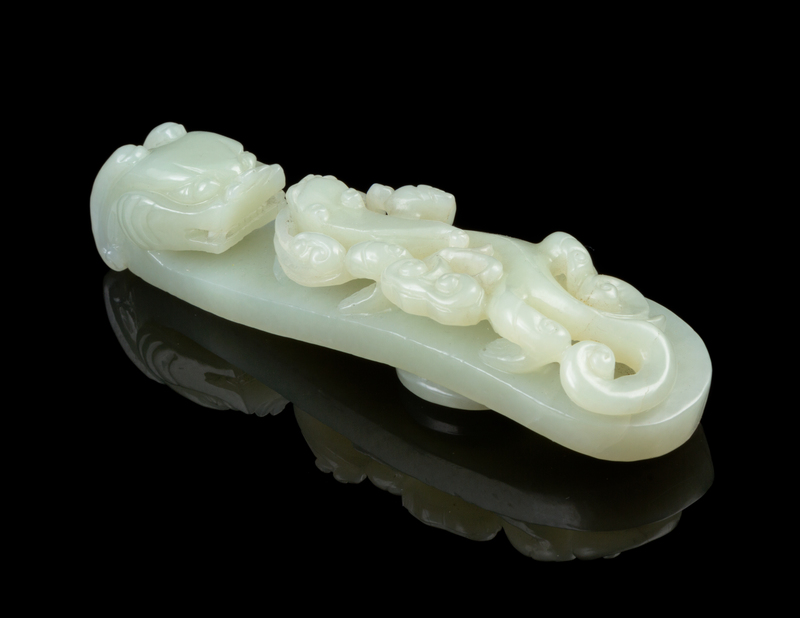 of a pale celadon stone, the hook carved to show a dragon head and the body openworked and relief carved to show a chilong holding a lingzhi in its mouth.