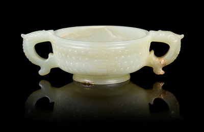 of a mottled pale celadon stone with russet inclusions, the cylindrical body worked to show raised bosses and shou characters, flanked by dragon's head handles, raised on a stepped circular foot.