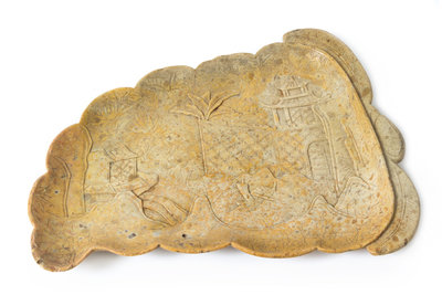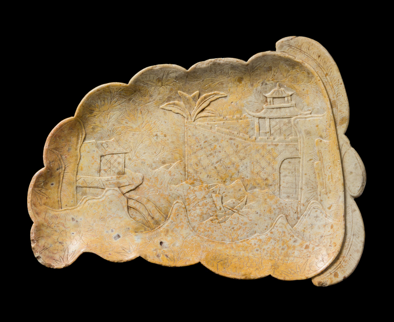 of a tan and brown stone, worked in low relief to show a boat in rough seas before palace walls, the background incised to show floral sprays.