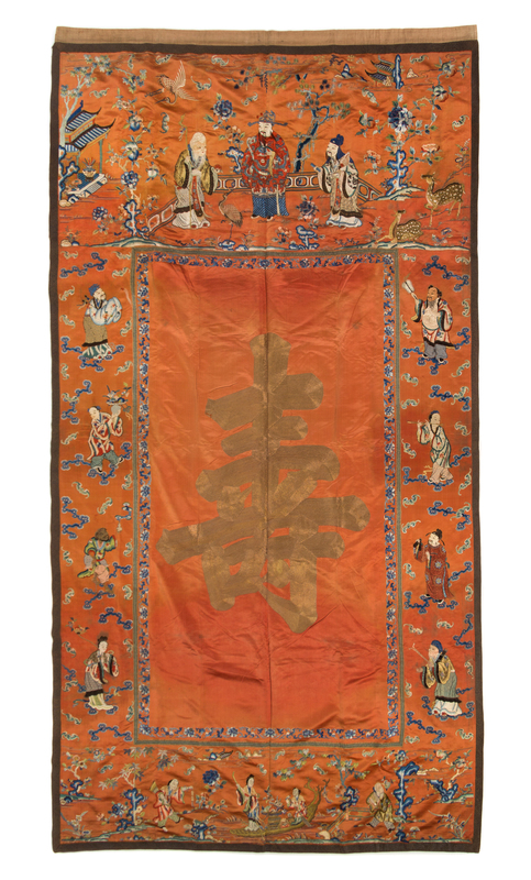 of rectangular form, depicting a central shou character, surrounded by eight immortals and other Daoist deities in an outdoor scene with trees and pavilion in the distance, all on a red ground.