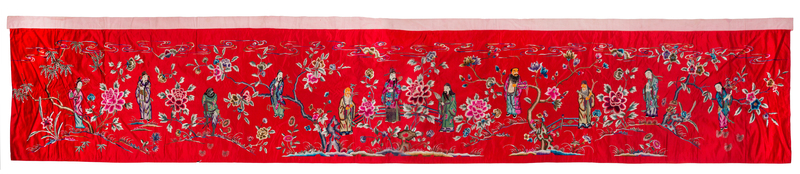 of rectangular form, depicting a continuous garden scene with eight immortals and other Daoist immortals standing amongst blooming flower heads and trees issuing from rockery, all on a red ground.