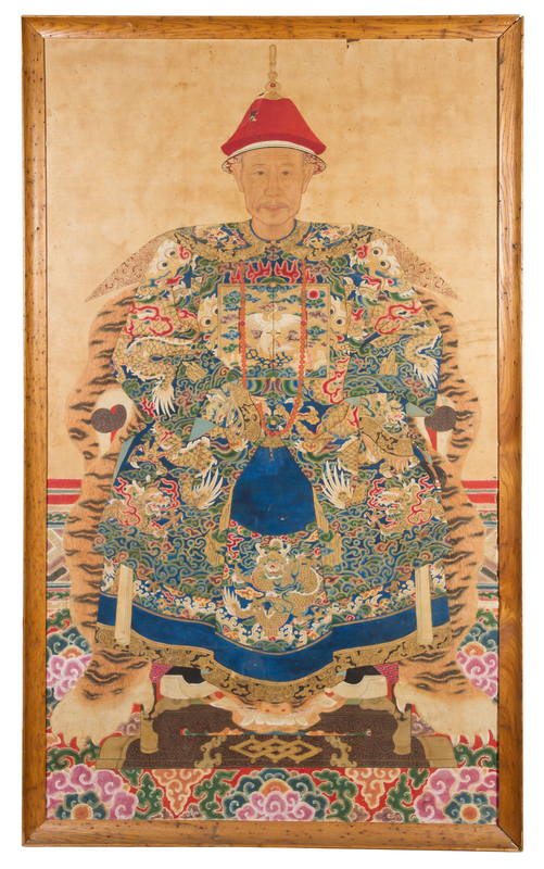 depicting a civil official seated on a tiger hide upholstered horseshoe back chair, dressed in dragon and ruyi cloud decorated robes with a crane rank badge, ink and color on silk, framed.