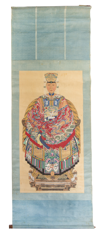 depicting the wife of a civil official dressed in a dragon robe bearing a crane rank badge, the lady seated on a tiger hide upholstered horseshoe back chair, ink and color on silk scroll.