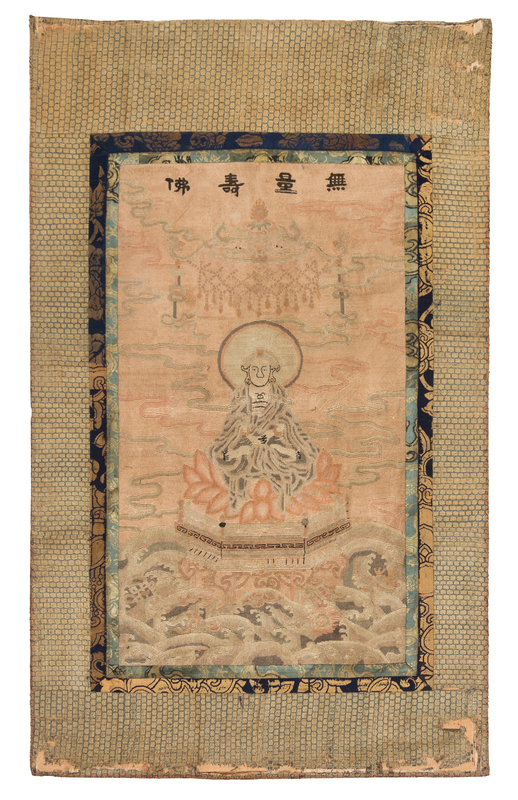 centered with the robed Buddha seated in dynasana on a double-lotus plinth raised on pedestal above waves and under elaborate canopy, the upper register embroidered with four characters reading wuliang shoufo (Amitayus), all reserved on a light salmon pink ground, the back of the textile worked to depict Buddhist emblems.