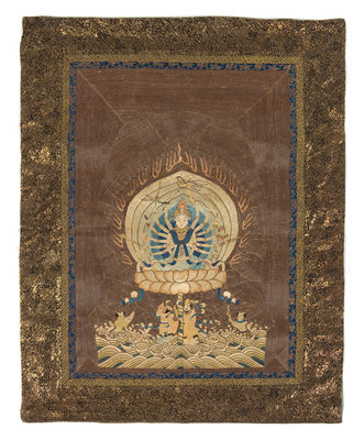 depicting a central multi-armed bodhisattva seated on top of a double lotus plinth in front of a flaming mandala, above immortal figures emerging from waves, all against a brown background.