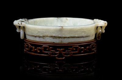 the oval shape bowl having a center band of relief carved dragons, with two archaistic lion-head handles suspending loose rings, raised on a one-piece hardwood stand carved with openwork stylized dragons.