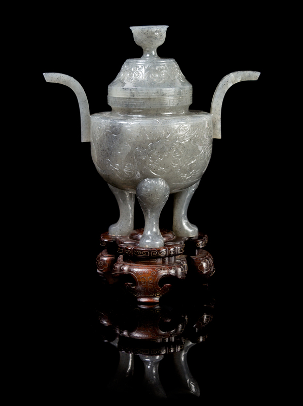 the grey stone with black and white specks, the compressed globular body raised on four legs with lion masks, carved in low relief to each side showing a sinuous dragon amongst clouds, having a pair of upright handles with C-scroll decoration, the domed decorated with ruyi heads and key fret borders, all raised atop a fitted hardwood stand with silver inlay.