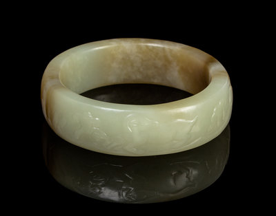 the wide semi-cylindrical bangle having celadon and brown skins, the exterior carved with three rams in a landscape with rocks and lingzhi.