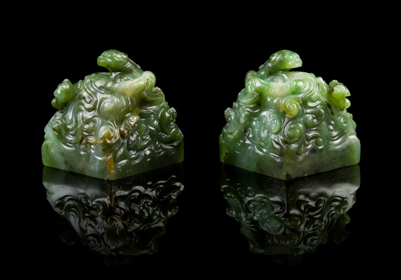 A Rare Pair of Chinese Imperial Spinach Jade Seals