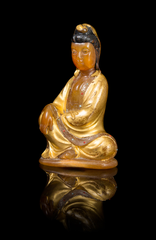 A Rare Chinese Gilt Tianhuang Soapstone Figure of Guanyin