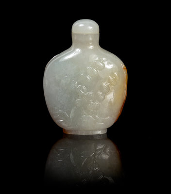 the white stone of flattened shield form raised on an oval foot ring, carved to the russet skin in relief depicting two carp, the reverse with seaweed and aquatic plants, having a white jadeite stopper.