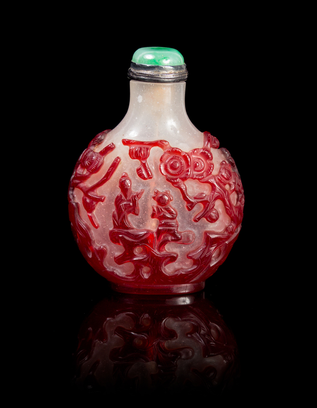 the flattened circular bottle having red overlay on a snowflake, carved in high relief throughout one side depicting scholars on a boat in a rushing river beneath pine trees, the other with an elderly with his attendant standing on rockery under flowering branches, having an apple green jadeite stopper.