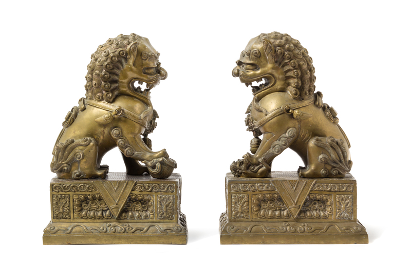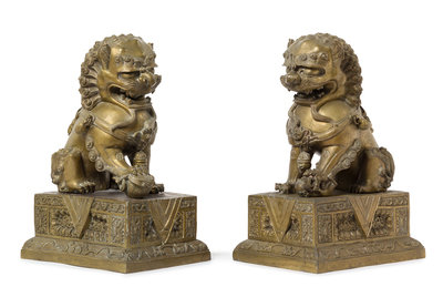 each seated on a separately cast rectangular plinth, the male with his right front paw on a brocade ball, the female with her left front paw on a small cub, each beast highly featured with open mouth revealing teeth and hand chased and engraved details, wearing a bell and tassel suspended from a flowing sash.