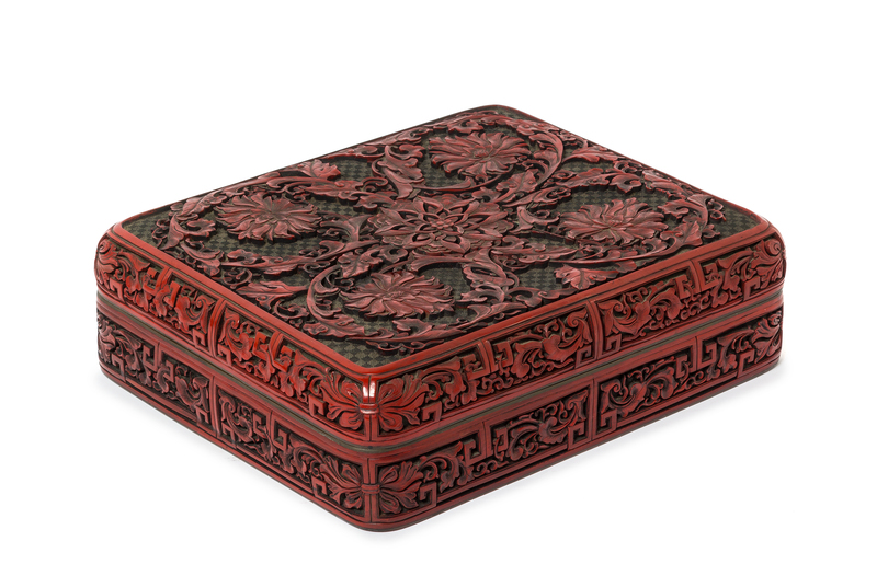 of rectangular form with rounded corners and gilt copper edges. The cover carved with stylized lotus flowers, scrolling vines and foliage against an incised diaper ground. The sides of cover and box are carved with archaic style key fret borders and leaves. Interiors and base covered in black lacquer.