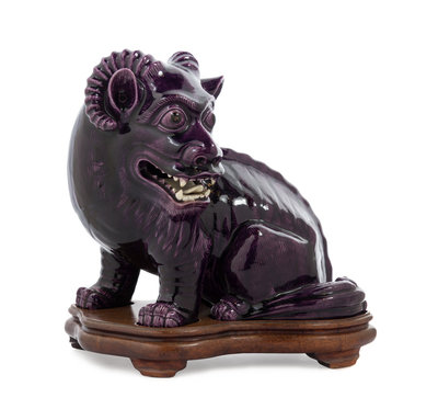 the large detailed beast covered in aubergine glaze with incised details to hair, tail, feet and face. The teeth and base unglazed revealing the white porcelain, raised on a fitted hardwood stand.