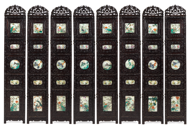 A Chinese Eight-Panel Famille Rose Porcelain Inlaid Hardwood Floor Screen