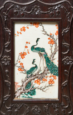 the porcelain panels painted to depict various scenes including birds perched on flowering branches, carp swimming amidst seaweeds, riverscape scene, flowering branches and mythical beasts, some with applied decoration depicting figures and flower-filled vases, all set in hardwood frames carved with blooming prunus branches and having removable reticulated headcrests depicting two confronting dragons chasing the flaming pearl against a floral background.