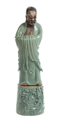A Large and Rare Chinese Celadon Glazed Porcelain Standing Figure of Damo