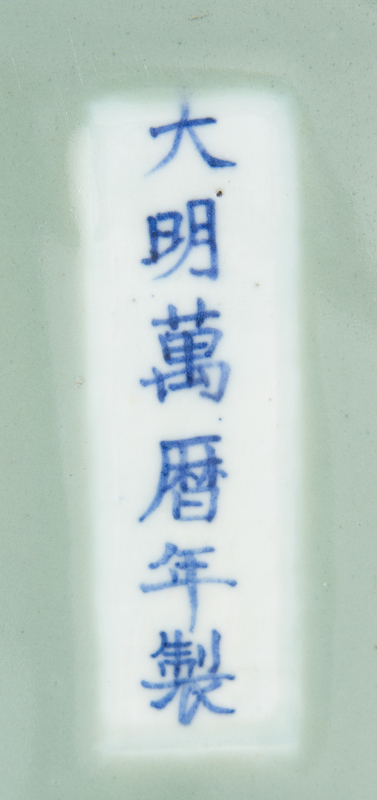 the figure depicted standing wearing draped robes, both hands clasped in front of his chest, the face with a stern expression with finely carved eyebrows and beards, all raised on a base in the form of turbulent waves, the figures back bearing a Wanli six-character underglaze blue mark.