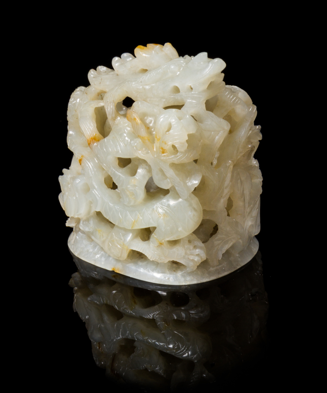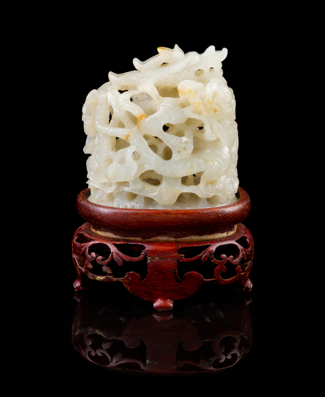 of a pale celadon stone with areas of russet color, carved in openwork depicting a sinuous five-clawed dragon amongst lotus scrolls, set on an oval domed base, raised on a later hardwood stand.