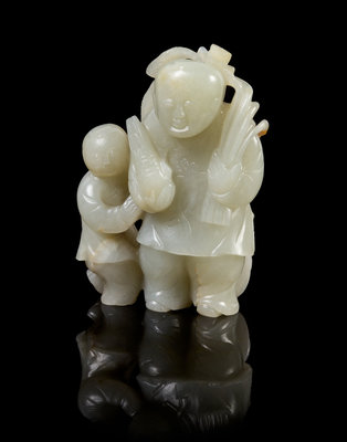 the stone of a light celadon tone with minor russet skins, carved to depict two boys one bearing a musical instrument in his right hand while the left hand holding rice stalk, lotus bud and lotus leaf.