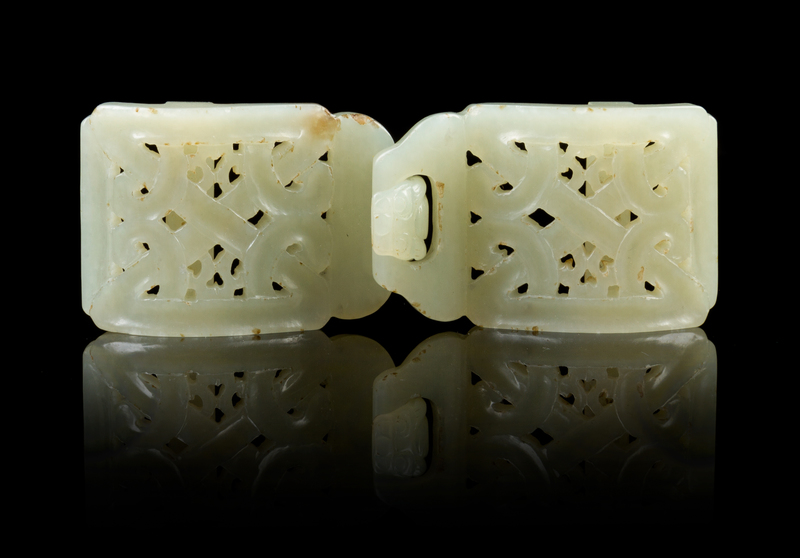 the buckle carved and pierced with archaic style geometric design, one part with dragon head hook, both reverses with rectangular loops.