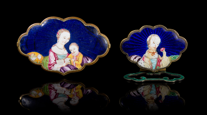 the set finely enameled depicting European figures, against a deep blue background, the buckle with woman in colorful dress, necklace and hair ornament together with a young child near a table set with tea and fruit, the hanger depicting a woman in colorful dress, necklace and hair ornament, bearing a flower branch in her left hand, mounted in gilt bronze frames.