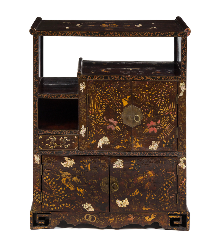 of rectangular section supported on four scroll carved bracket feet, the upcurved top centered with a shou medallion circled by four flower heads and clouds, having further cranes on each side, above a large rectangular shelf and two small rectangular shelves beside two hinged doors and a small drawer, further raised on two hinged doors, decorated to the whole exterior with mother-of-pearl, shagreen and simulated tortoise shell depicting a pair of confronting phoenixes and a pair of confronting sinuous ferocious dragons amongst clouds, the shaped apron having a central shou medallion with interlocking circles, leaf and melons on the sides.