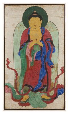 depicting the Buddha Sakyamuni standing barefoot on lotus plinth, wearing flowing robes with his hands raised to the chest in namaskara mudra, the face with a serene expression and the hair in knots surmounted by ushnisha, ink and color on paper, framed.