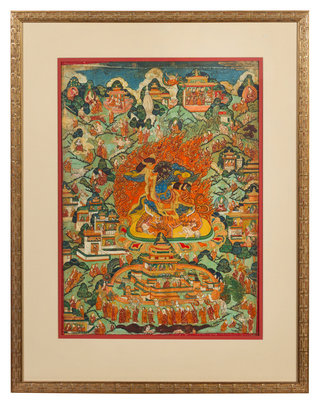 painted to depict a central deity seated on a tiger before a flaming mandala, surrounded by scenes of llamas in procession on mountainside, having Tibetan inscriptions on reverse.