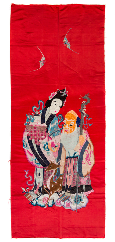 the rectangular panel worked to depict Shoulao, the immortal of longevity, bearing a staff in his left hand while holding a peach in his right hand, standing next to the female immortal Magu, with both her hands supporting a tray of small peaches, a deer standing between the two immortals and two bats flying above them, all reserved on a red ground.