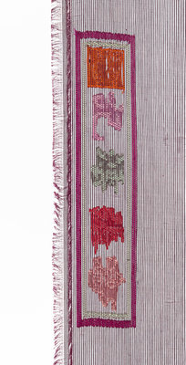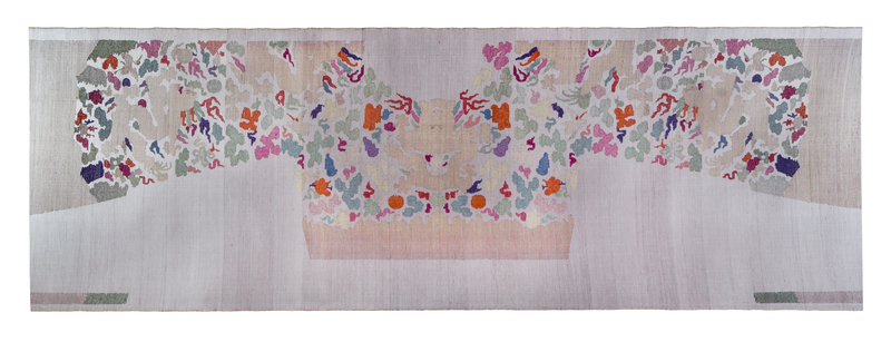 worked to the center depicting gold dragons chasing the flaming pearl of wisdom, having further confronting dragons chasing the pearl amongst auspicious clouds with bats above lishui stripes to the ends.