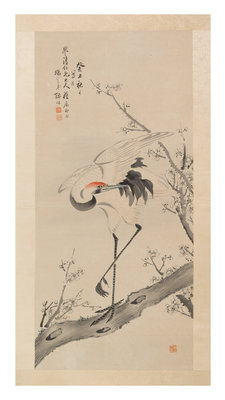 depicting a crane perched on flowering prunus branches, signed and sealed, ink and color on paper.