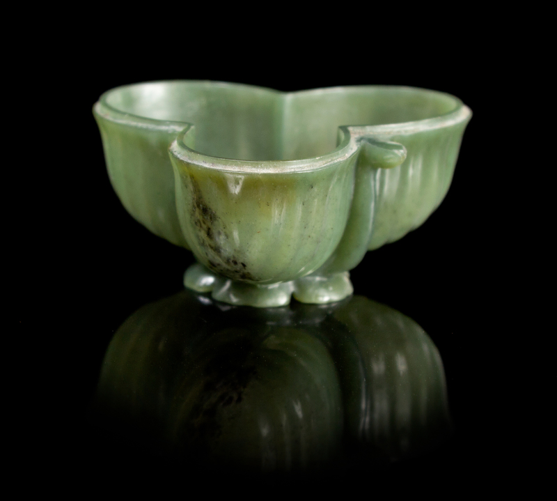 the small even green jade three-lobed cup raised on a base in the form of a flower head with the stem forming the handle.