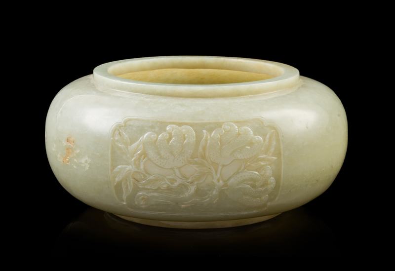 of a pale celadon stone, the flattened ovoid vessel with three relief carved panels, depicting pomegranate among prunus, a peach tree and flowering citron.