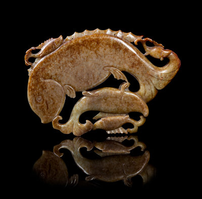of a mottled brown and red stone with areas of russet skin, openworked to show five intertwined fish of graduated size.