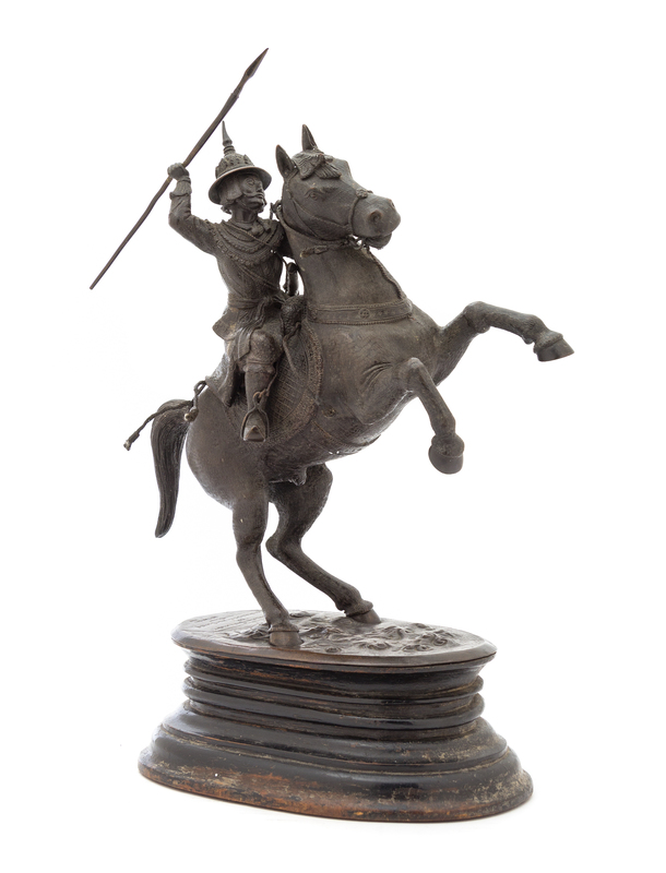 depicting General Maha Bandula, the figure seated on a rearing horse and dressed in full Burmese armor holding a spear in his hand, raised on shaped base engraved with script.