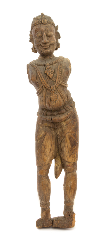 depicted standing with beads and ornamentation dangling from around the figures neck, set on an acrylic wall mount.