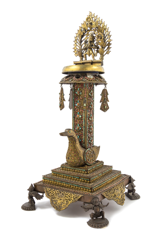 the rectangular column surmounted by a circular dish and a figure of Ganesha before a foliate decorated mandala, raised on a recumbent duck and stepped square base, raised on Garuda form feet.