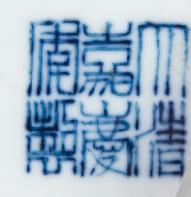 the rectangular rest with lobed corners, the top painted to show confronting dragons flanking a flaming pearl amongst ruyi clouds over reticulated sides within scroll borders, bearing a six-character Jiaqing seal mark in underglaze blue to the underside.