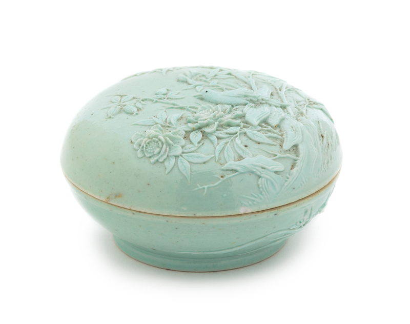 A Chinese Celadon Glazed Porcelain Molded Seal Paste Box