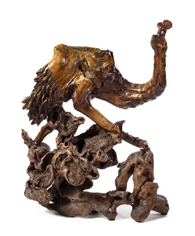 the bird depicted standing with head turned up toward the sky, holding a lingzhi in its beak, raised on a rootwood stand.