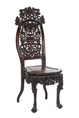 the openworked crest worked to show lotus scroll above a similarly worked back incorporating fu bat and shou character decorated urn, the shaped seat with beaded edge over openworked seat rail raised on square S-scroll forelegs ending in foliate carved feet.