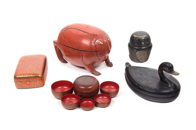 comprising one owl-form, one duck-form, one large beetle form, a rectangular box and a small circular box enclosing five lacquered bowls.