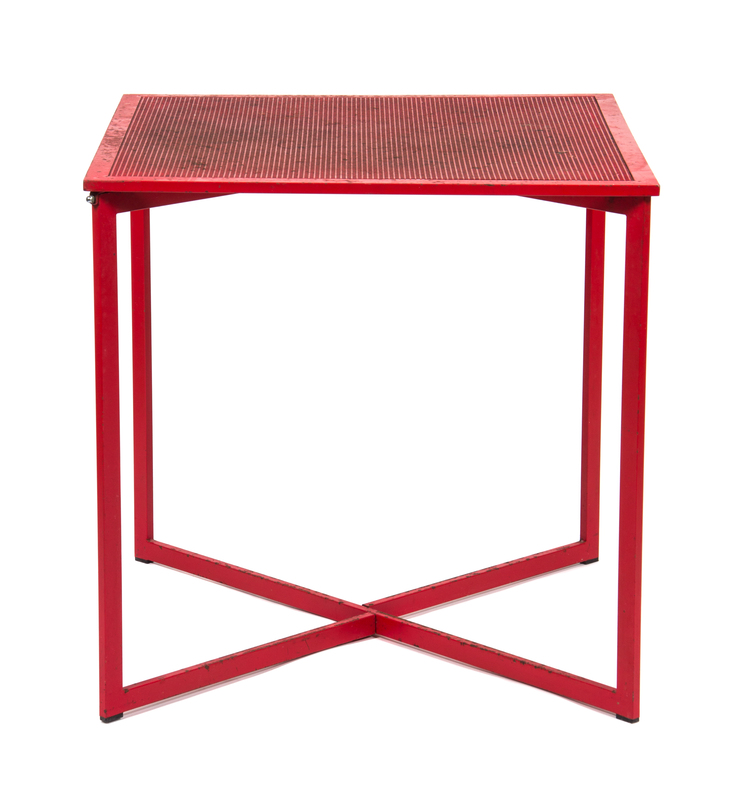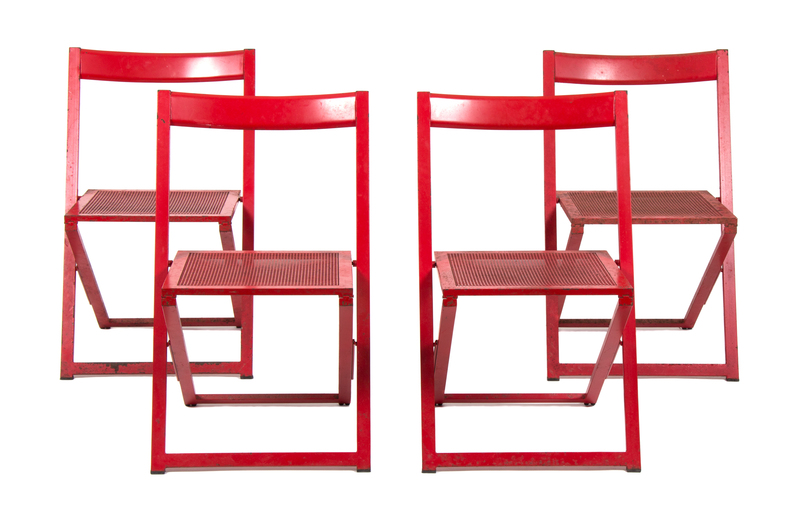 A Red Painted Metal Card Table with Four Folding Chairs