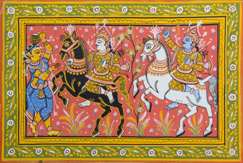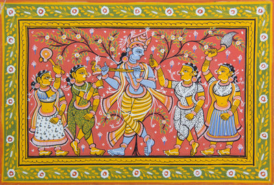 one depicting Lord Krishna dancing with his gopis (cow-herd girls); the second depicting two Indian gods, Balabhadra and Jagannath offering a ring to a milk-maid.