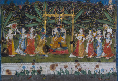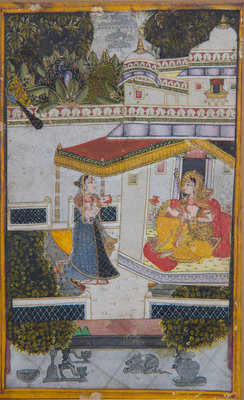 one depicting Lord Krishna surrounded by devotees; the other depicts Meera bai holding the veena instrument