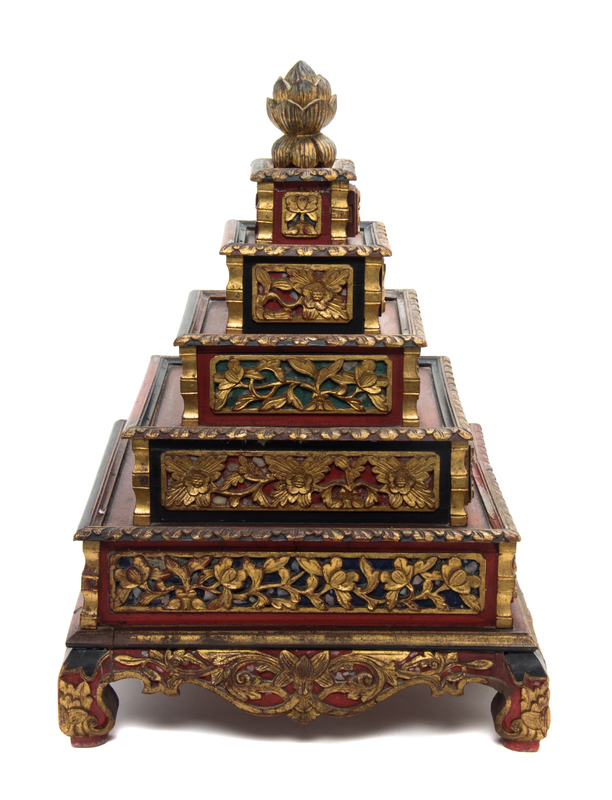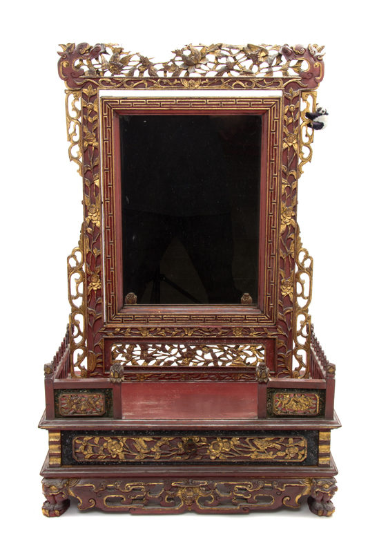 A Chinese Parcel Gilt Red Lacquer Carved Wood Dressing Mirror