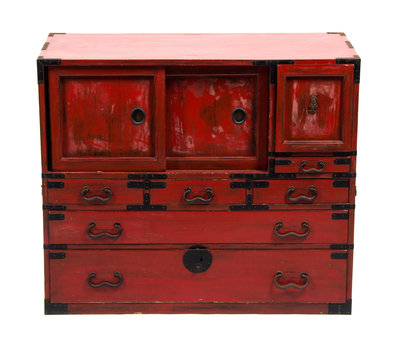 the rectangular case fitted with a pair of sliding doors and a cupboard door over three short over two long drawers.