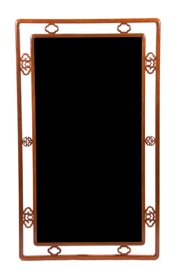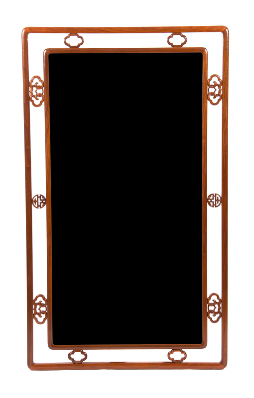 having a rectangular beveled edge mirror plate within a double spaced framed connected by ten pierce carved symbols